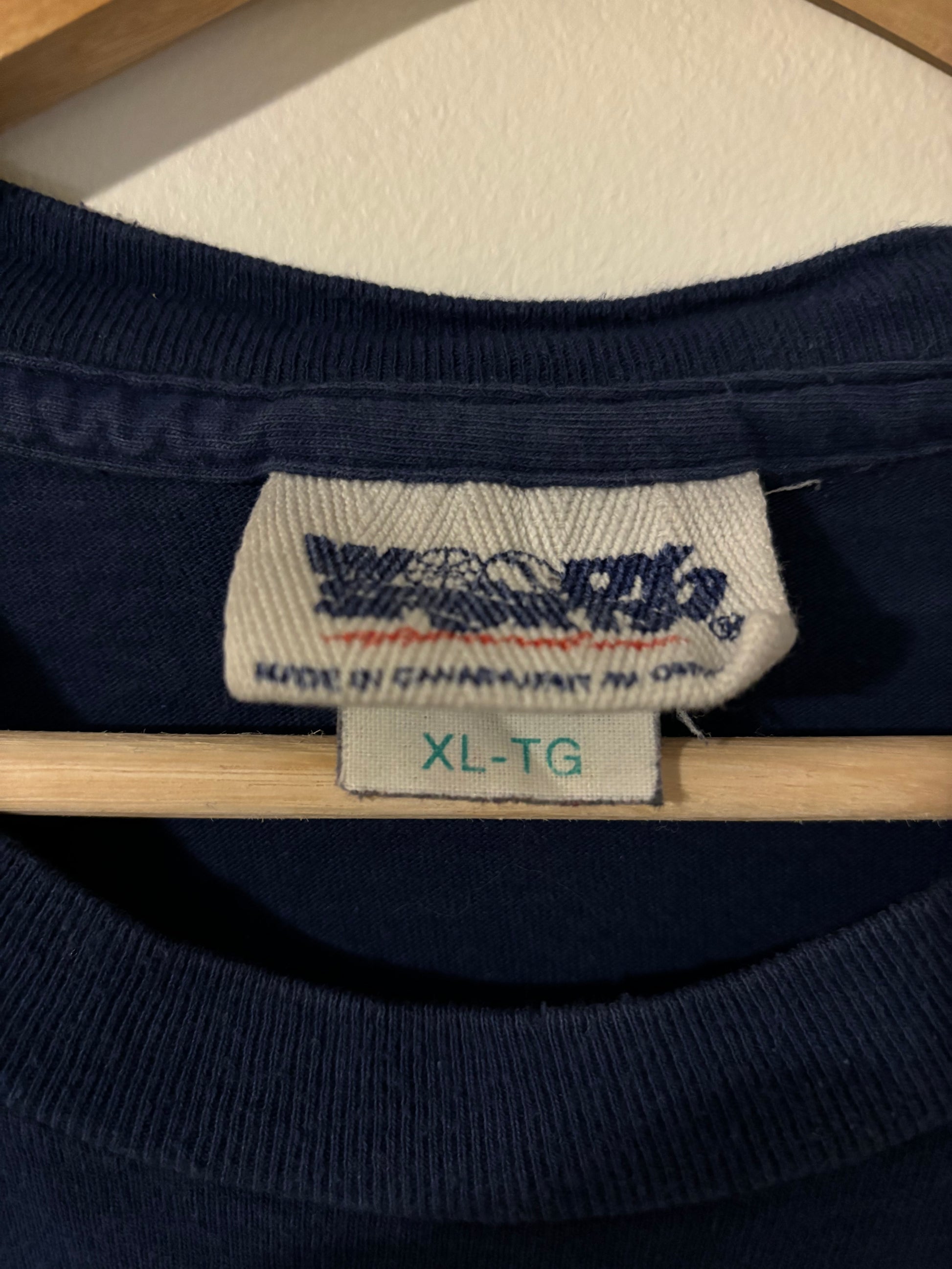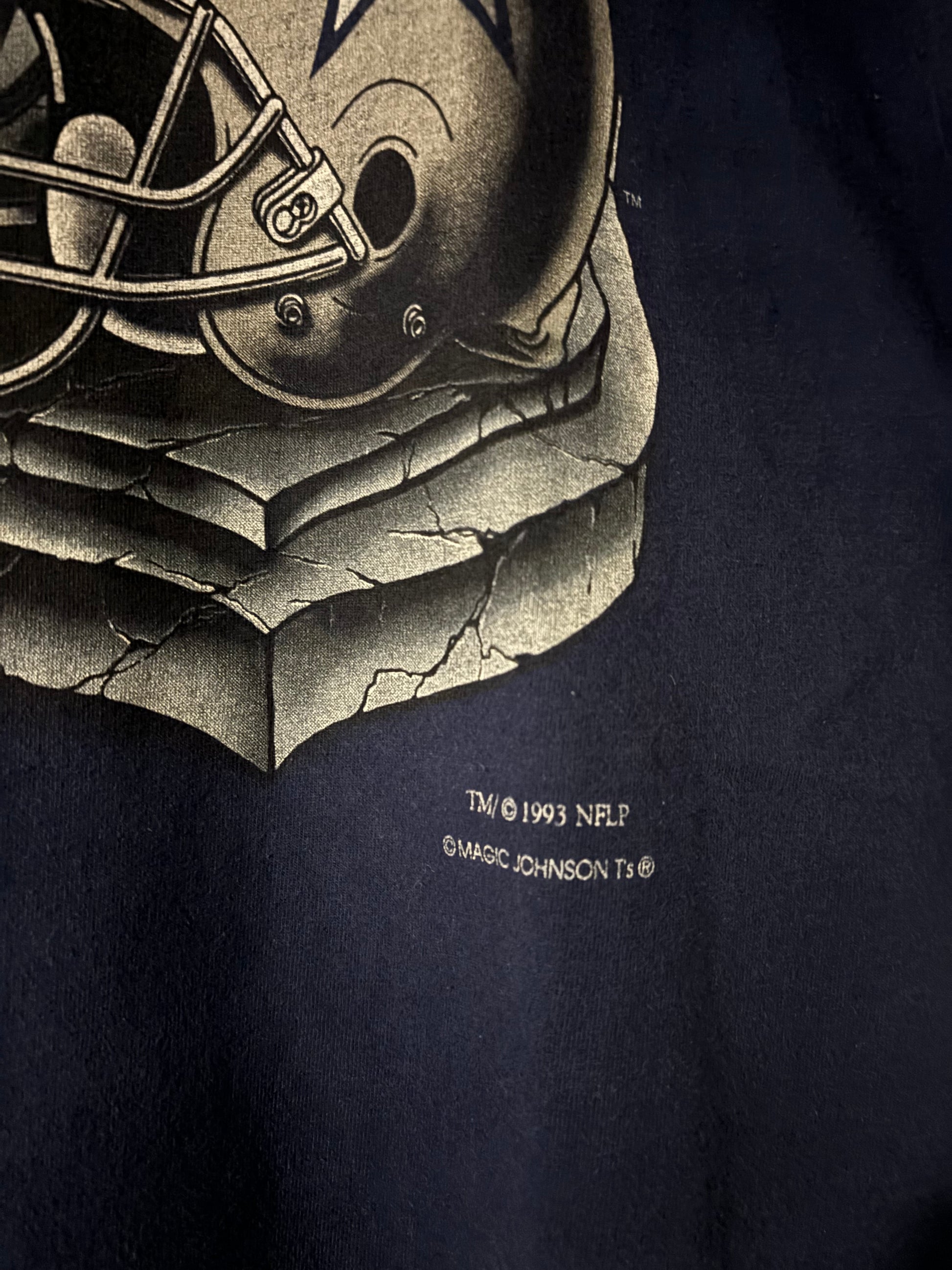 Size XL Navy 1993 Dallas Cowboys Concrete Tee. Big front graphic with the vintage Cowboys helmet logo and spellout graphic. Blank back. Fits like a small XL/closer to a Large.