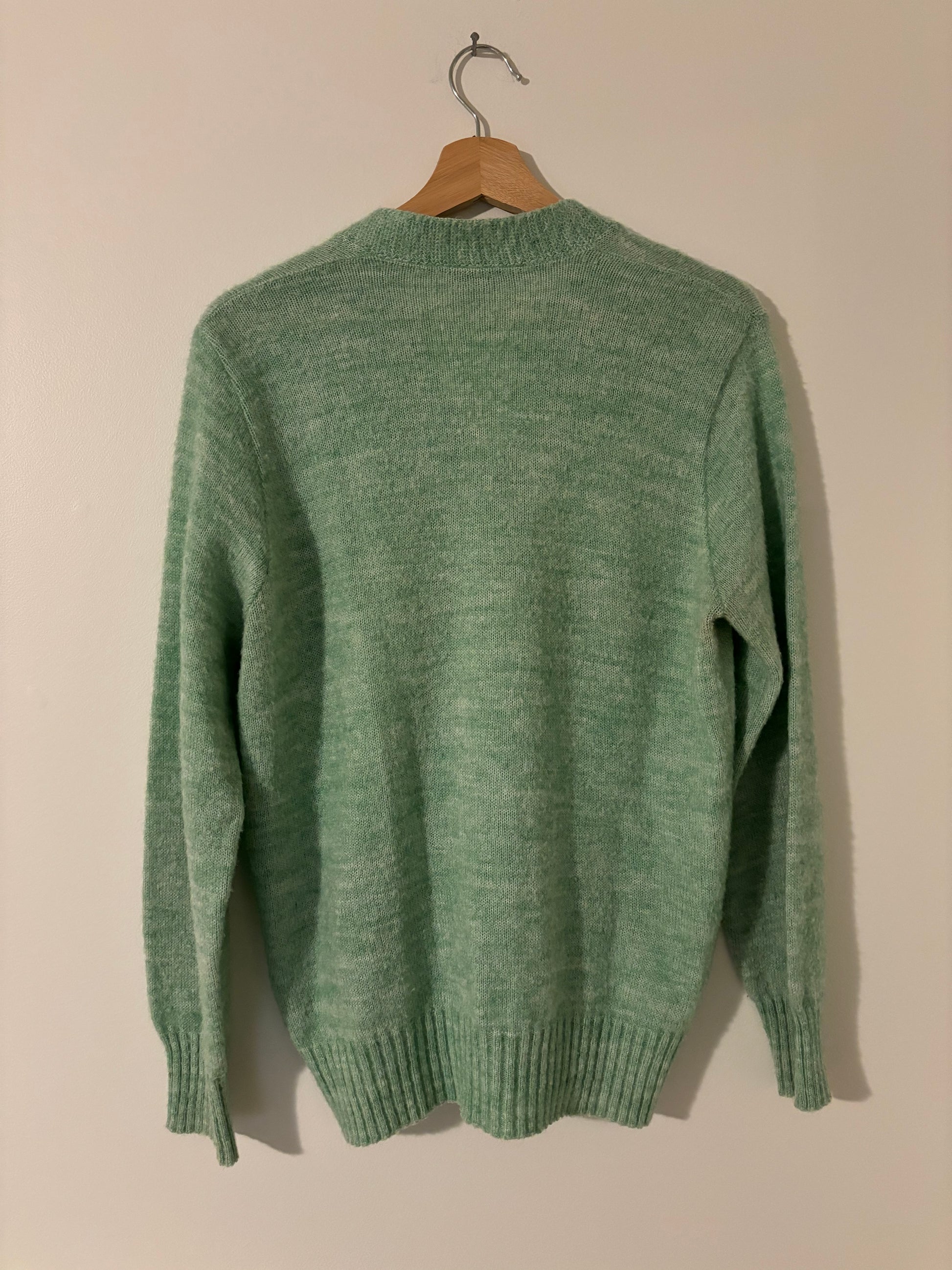 Size Medium Cooper Mohair Light Green Cardigan. Super soft and loose fitting cardigan with a very nice light green/white wash colour.