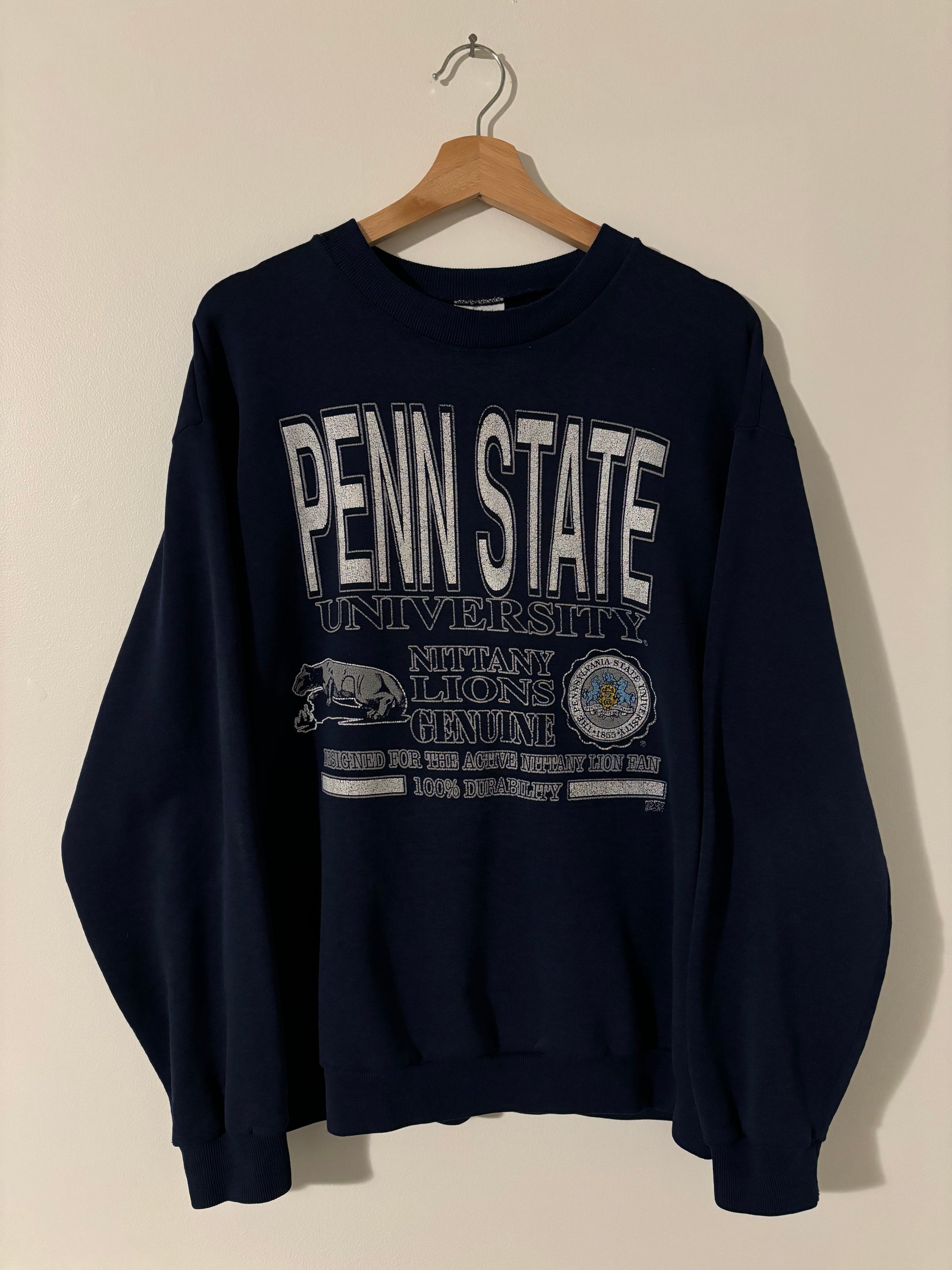 Size Large Navy Penn State University Crewneck. The tag is a Large but fits more like a Medium. Super soft and lose crewneck. Penn state spell out graphic and logo on the front.
