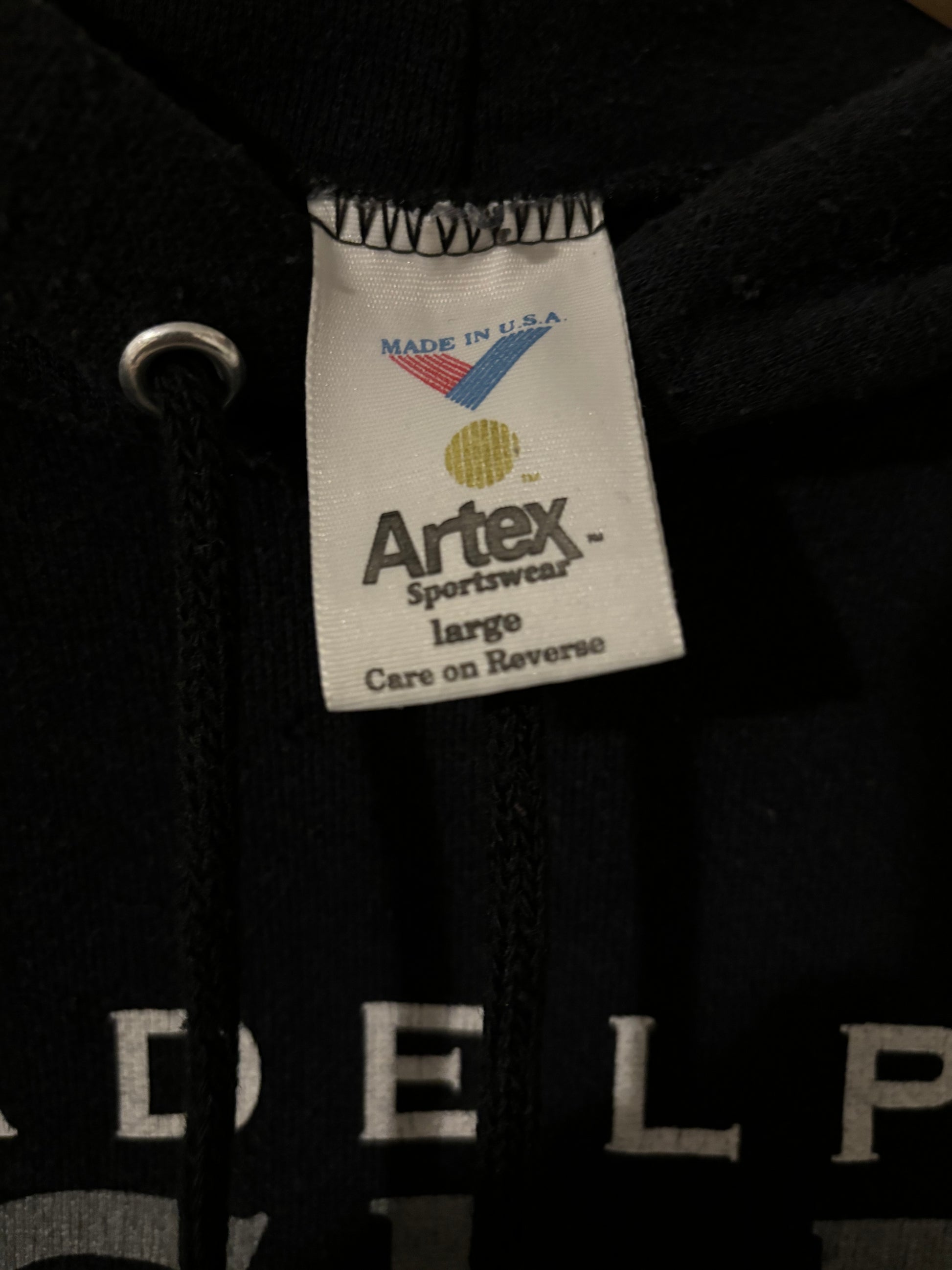 Size Large Philadelphia Eagles Hoodie. Fits like a Medium but the tag is a Large. Big green eagle logo across the front with a big spell out logo. Small mark on the sleeve.