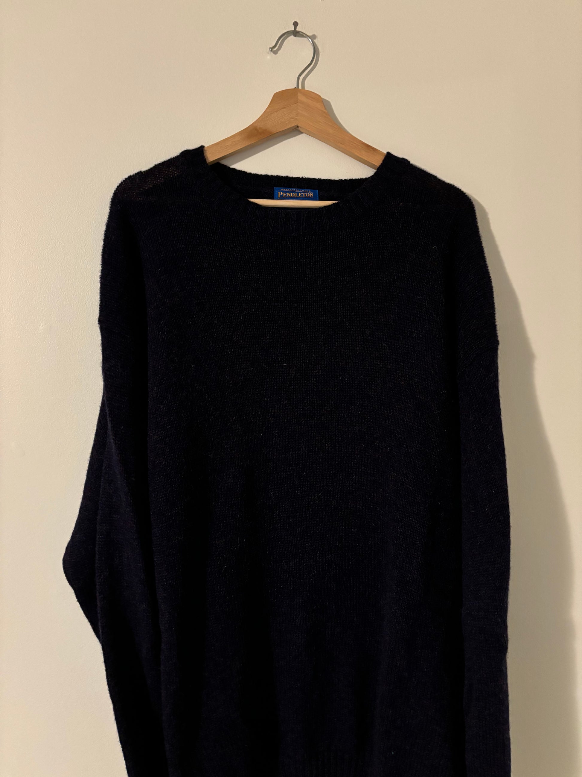 Size XL Vintage Pendleton 100% Wool Sweater. Fits are very loose and long/baggy. This sweater has a very nice and subtle purple/black peppery colour.
