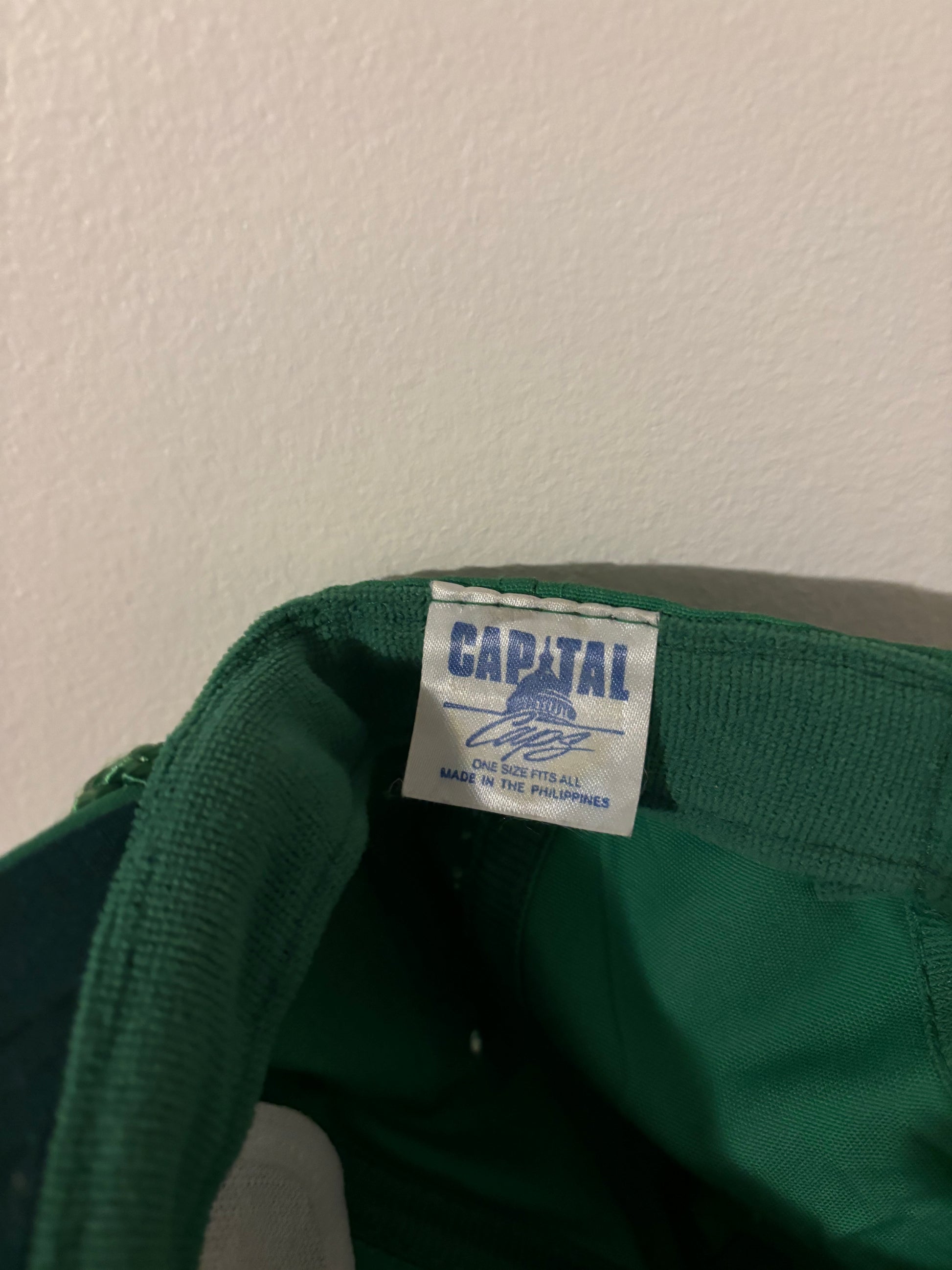Vintage Green Petro Rope Hat with multiple patches and a leather adjustable strap. One size fits all. All patches are embroidered.